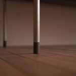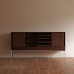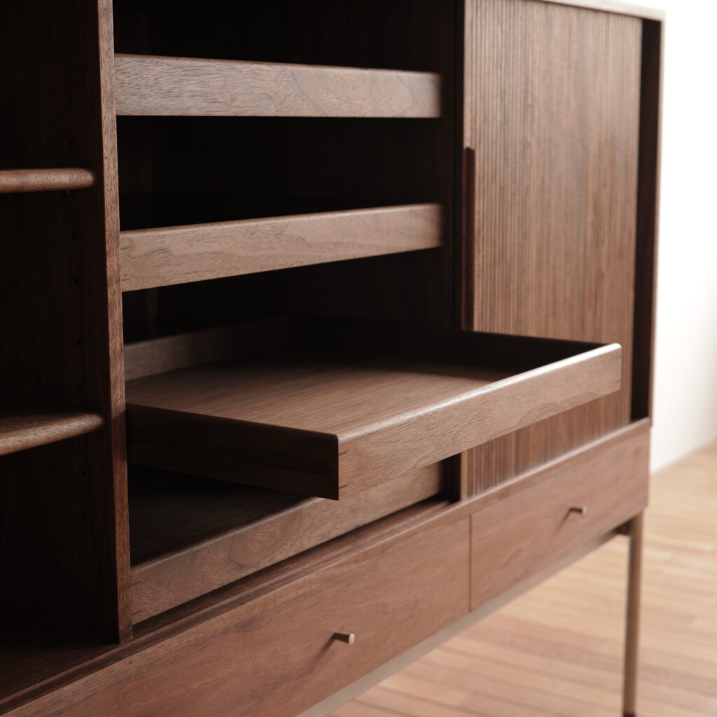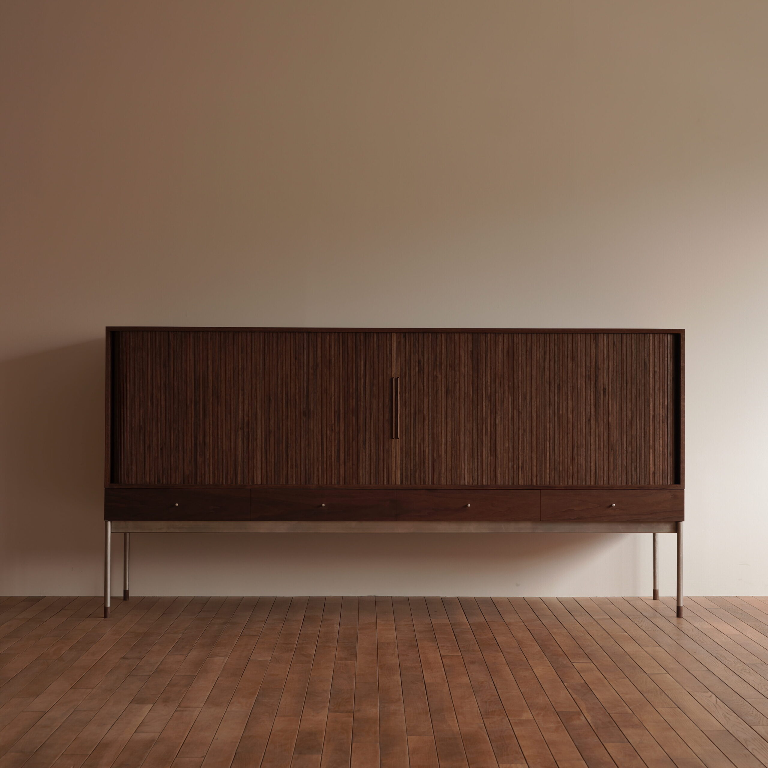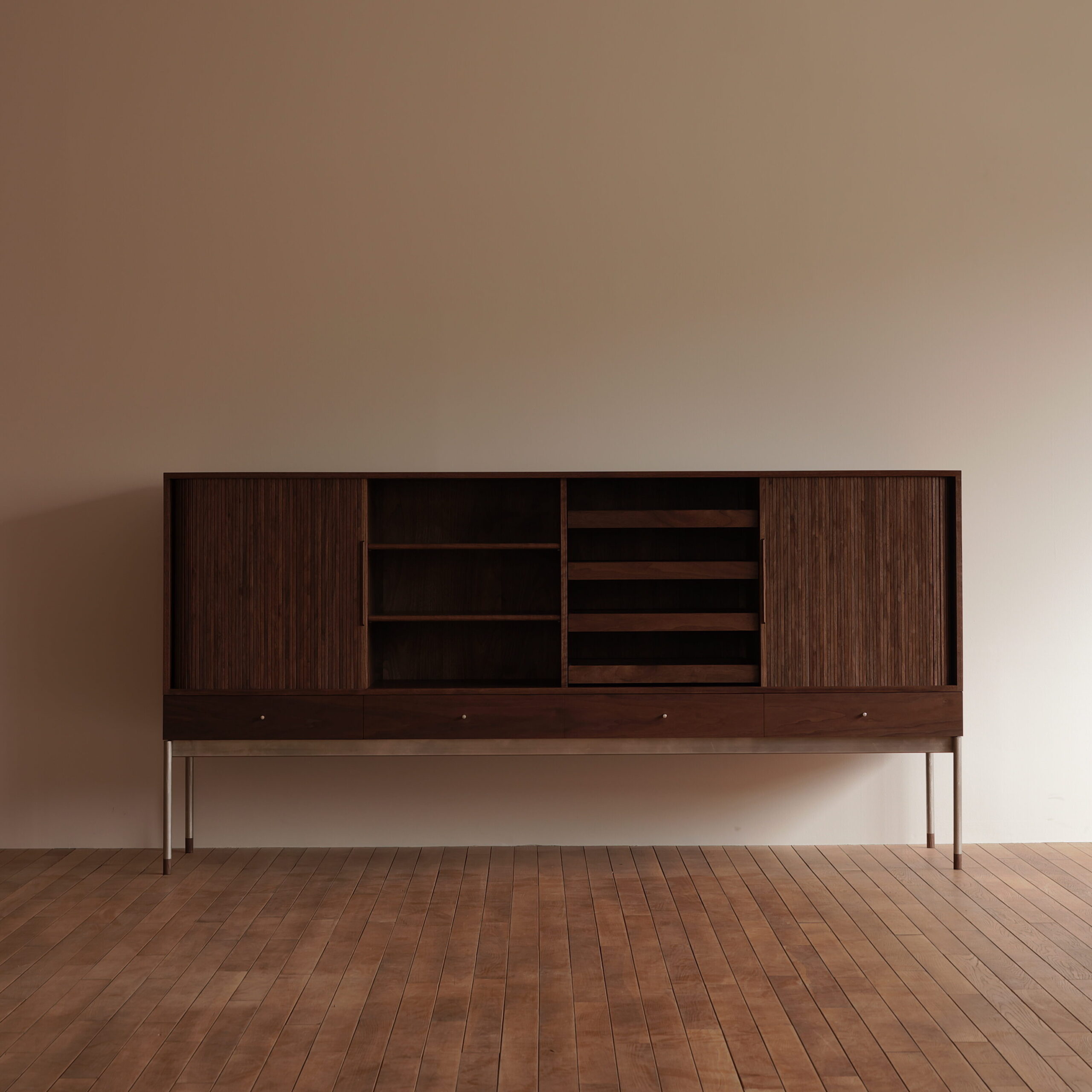040 ブラックウォルナットの深い色合いとステンレスのマットなシルバーが良いコントラストとなっている蛇腹扉のリビングボード。 少し深さのある棚板は、そのまま取り出せトレーとして使用できるようになっている side board size : w1800×d450×h900 material : black walnut , sus finish : oil