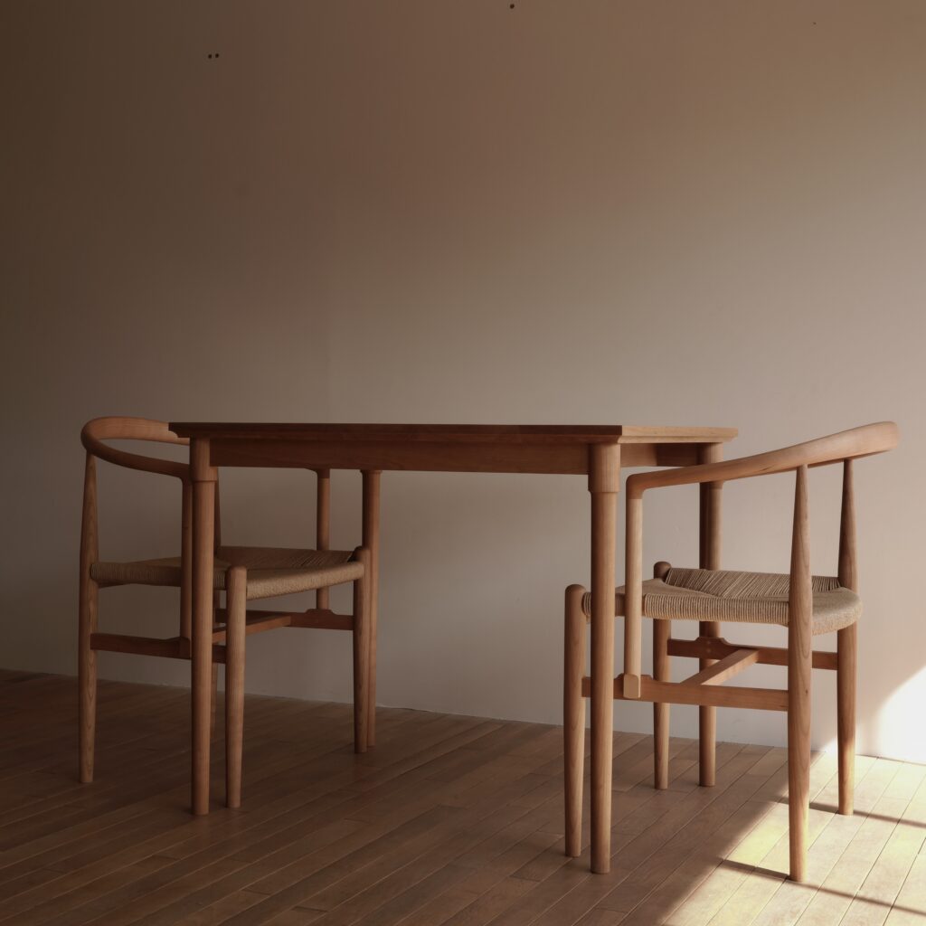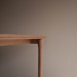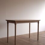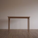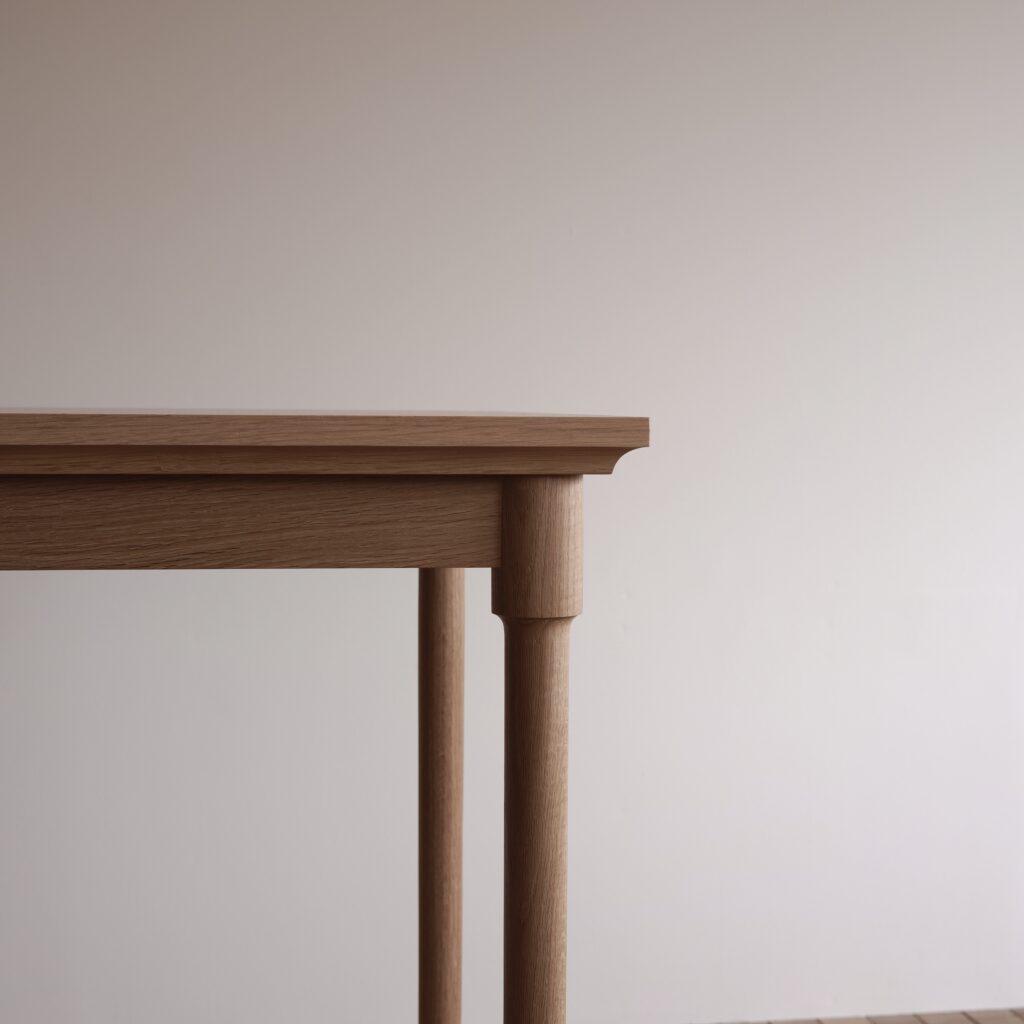 065 店舗用に製作したコンパクトなテーブル。 通常の丸脚テーブルに少しだけ意匠を施した。 アームチェアとの兼合いを考え、椅子を置く位置の幕板はセットバックさせている。 table size : w1000×d500×h675 material : oak finish : oil