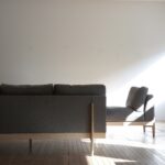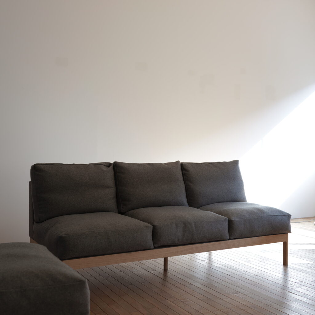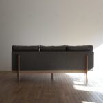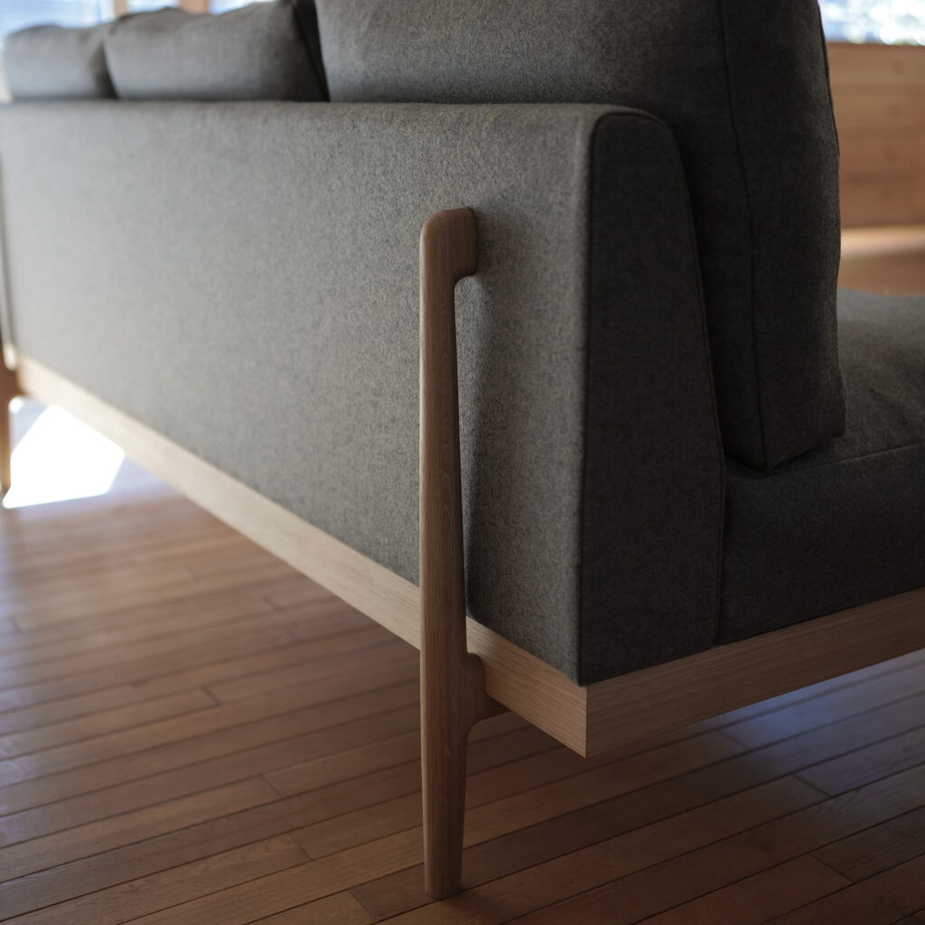 背面が美しいソファを目指し、生地張りの本体に木製の脚がスラリと伸びる構造とした