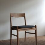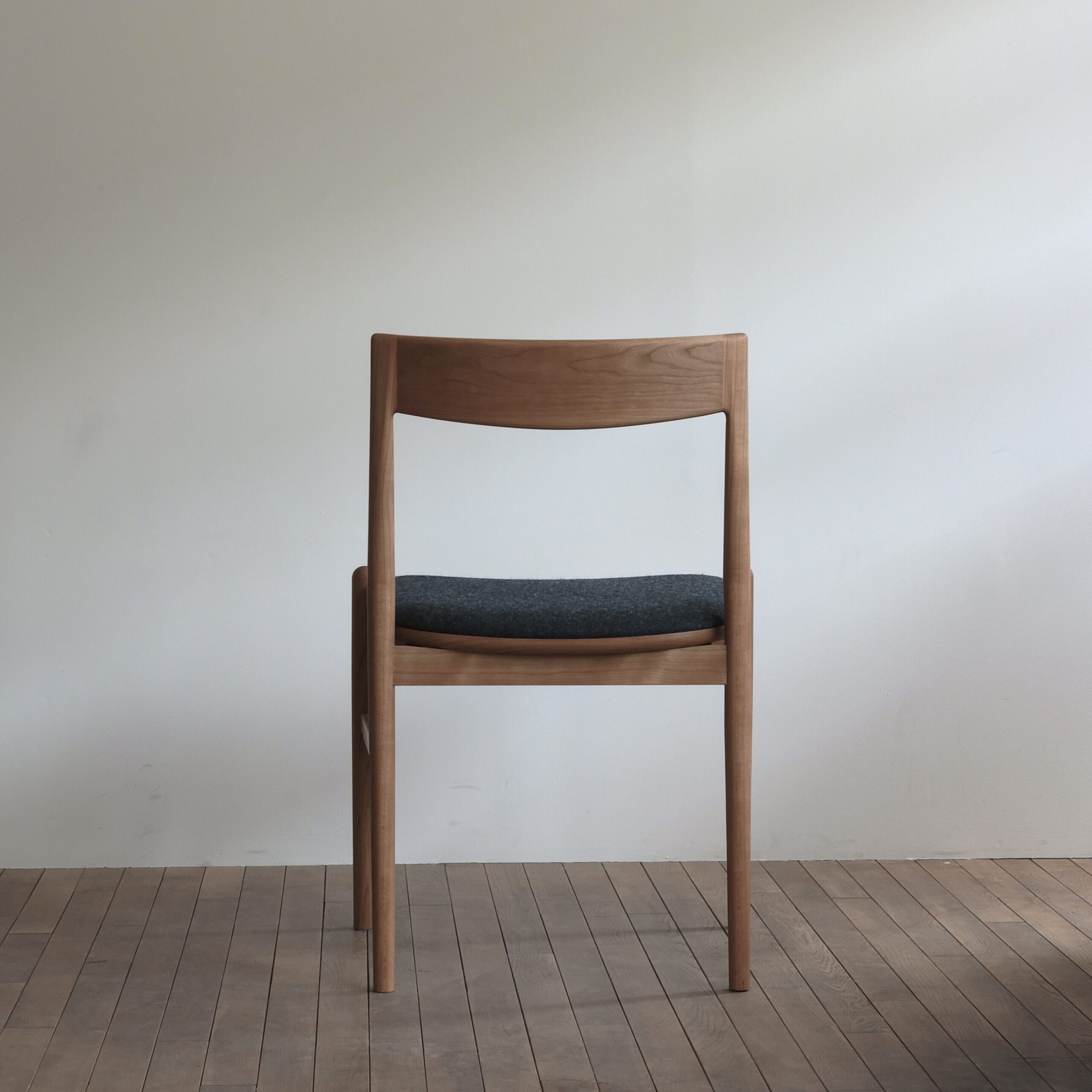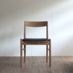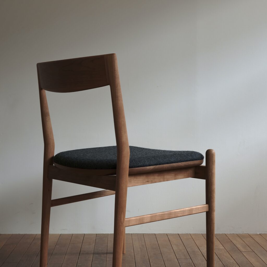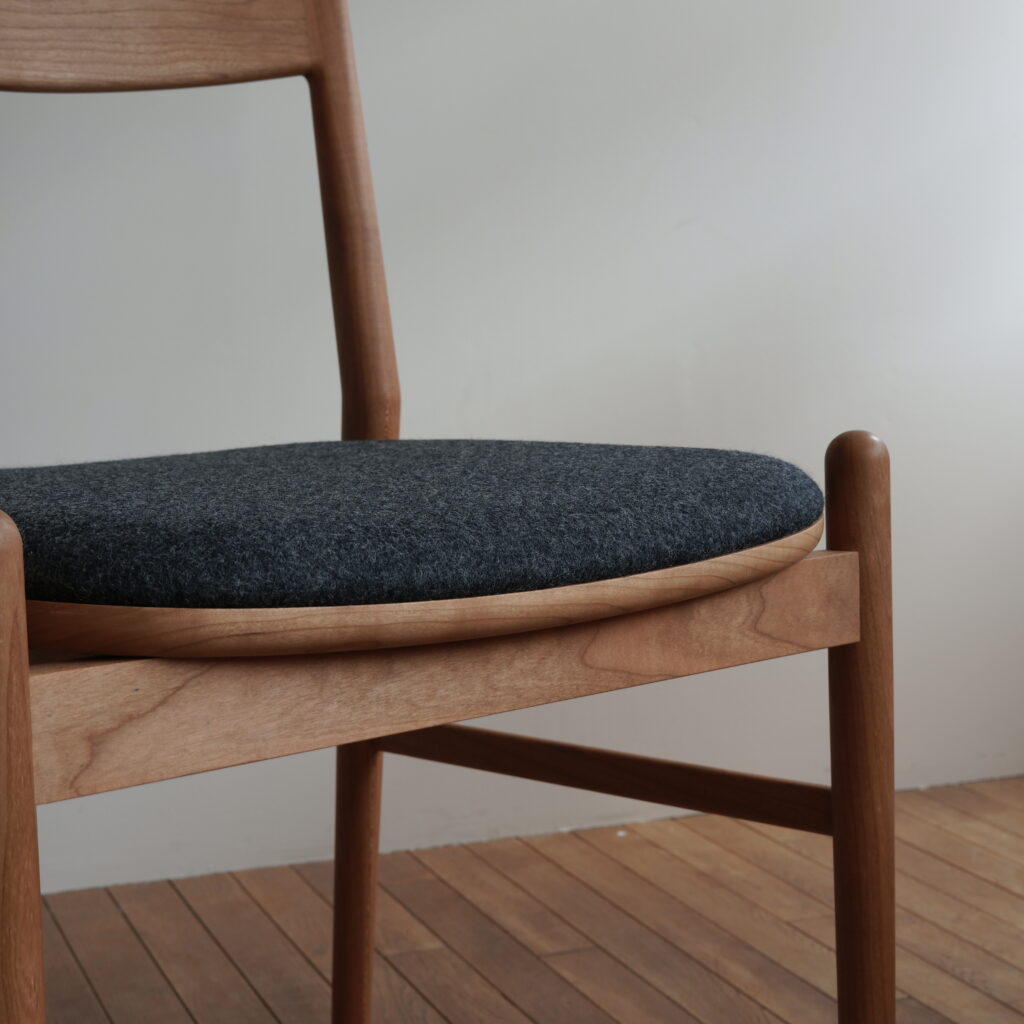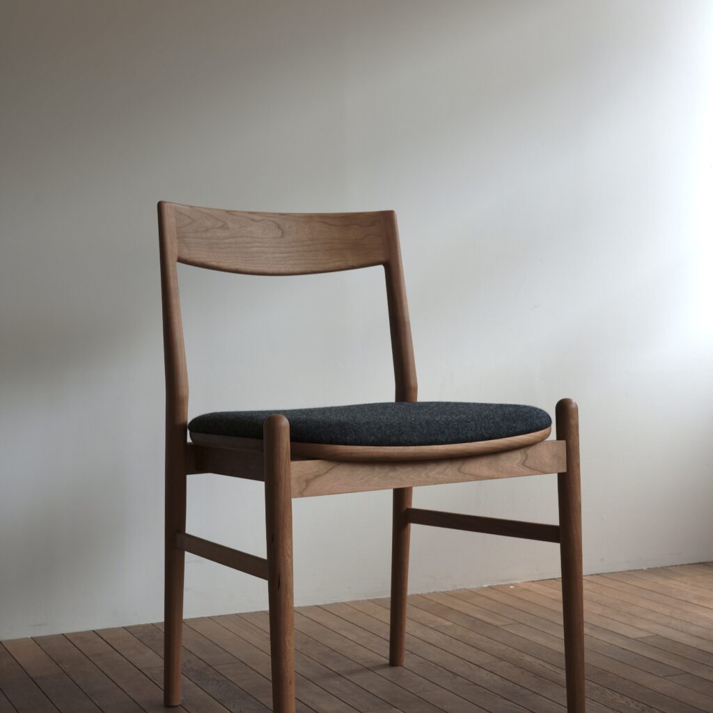 071 定番の06チェアをアーム無し板座で製作し、薄い布座と組み合わせている dining chair size : w504×d495×h750 material : black cherry finish : oil