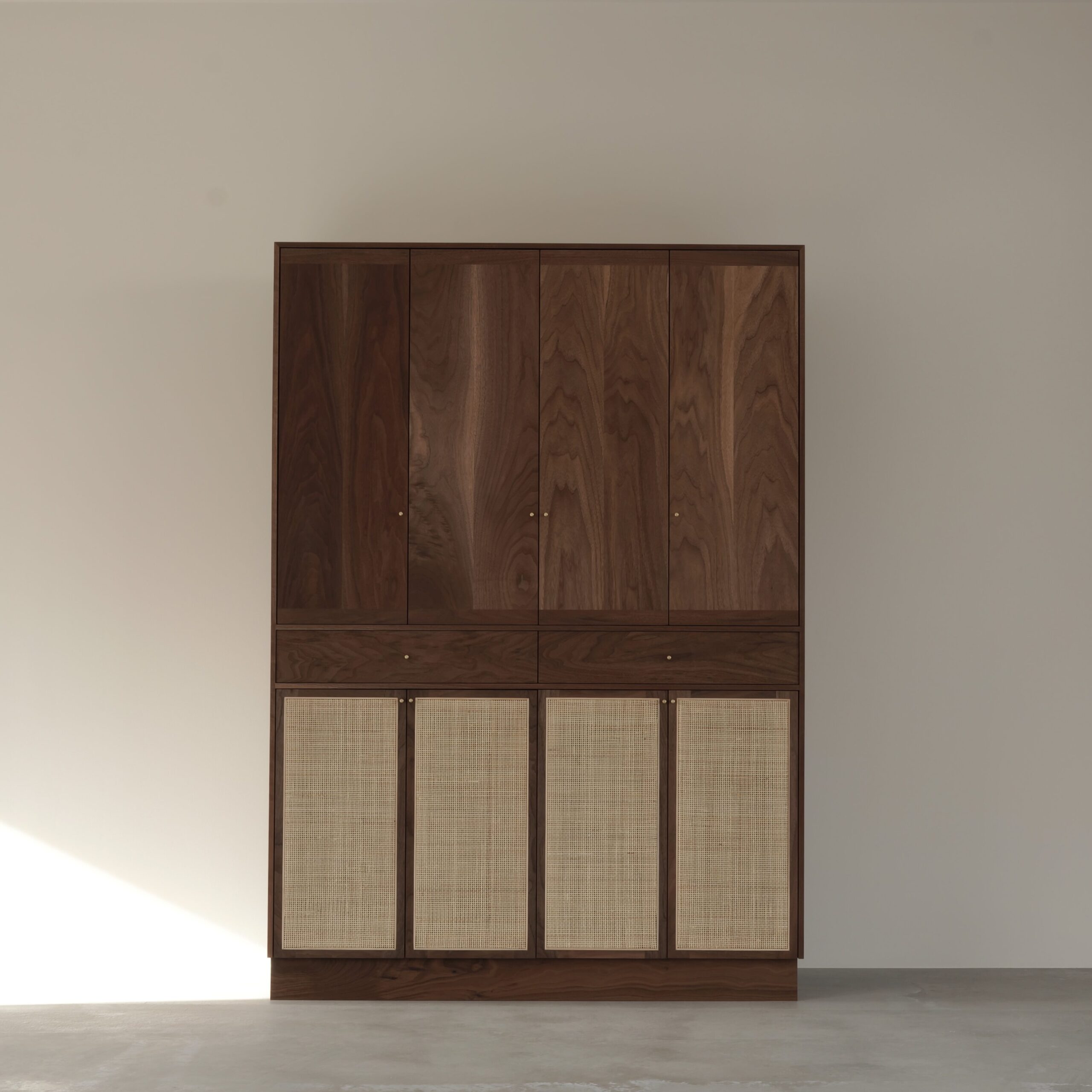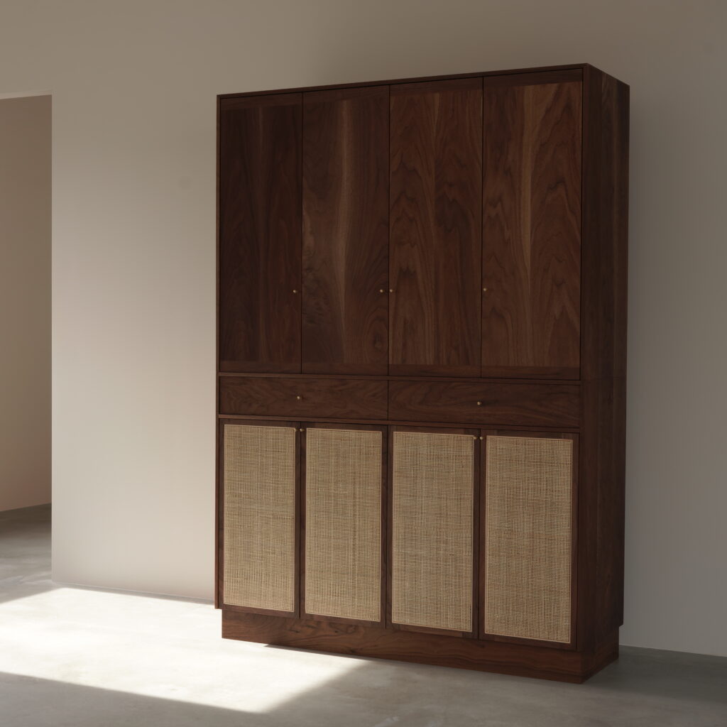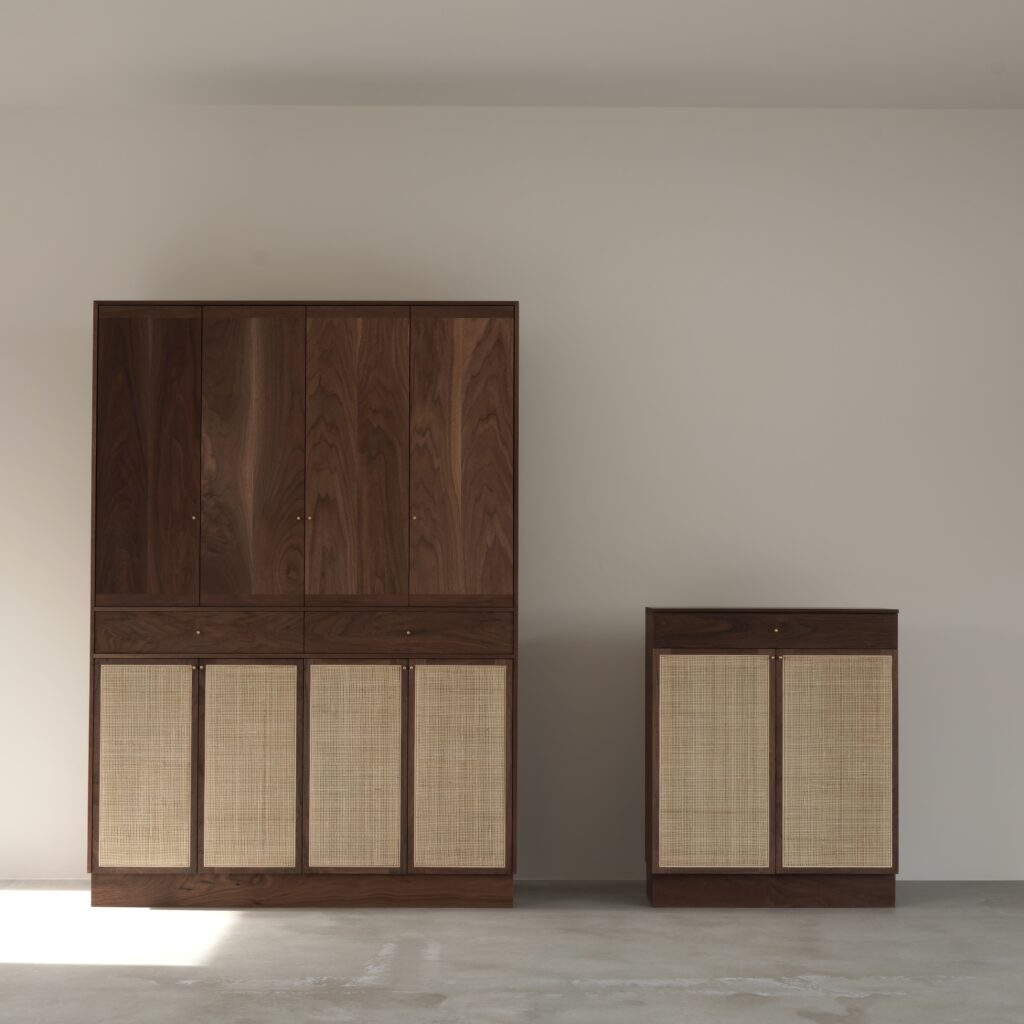 082 カップボードのような佇まいだが、仏壇件リビングボードとして製作した。 上部中央の観音開き部分が仏壇スペースになっている。 cabinet size : w900×d400×h1720 material : black walnut , rattan finish : oil