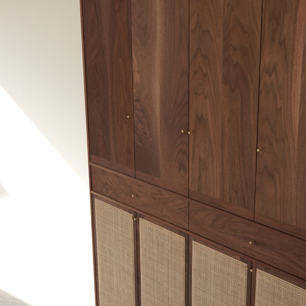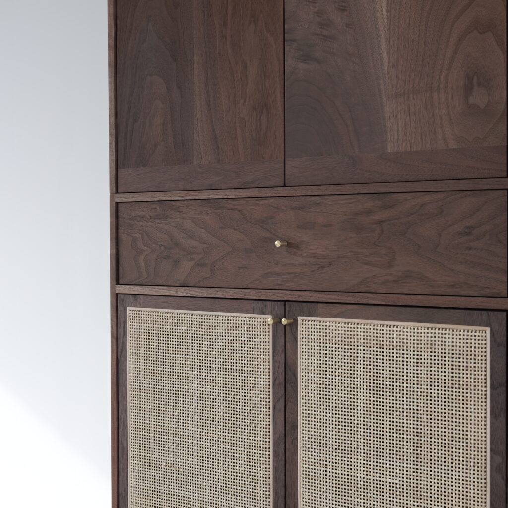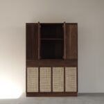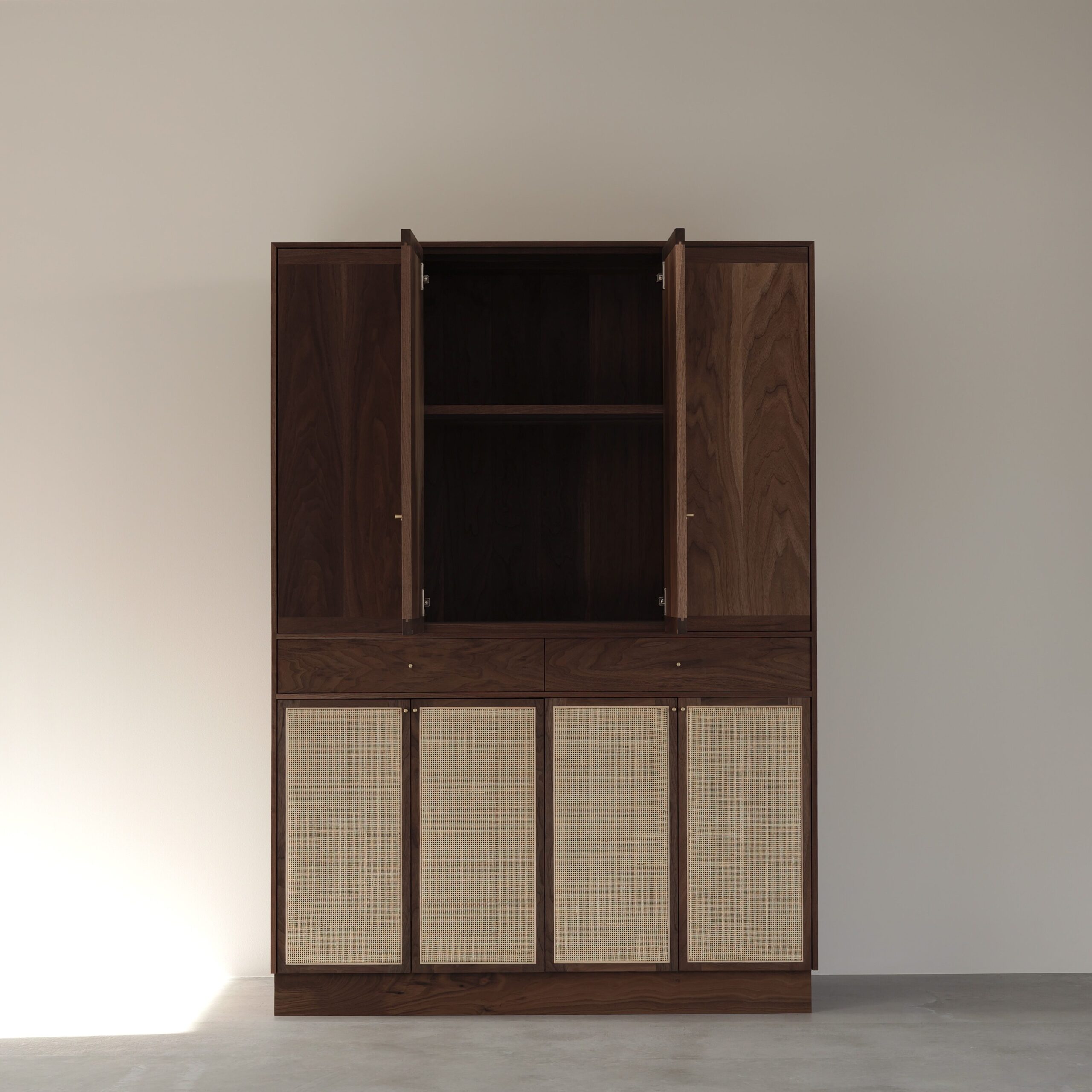 082 カップボードのような佇まいだが、仏壇件リビングボードとして製作した。 上部中央の観音開き部分が仏壇スペースになっている。 cabinet size : w900×d400×h1720 material : black walnut , rattan finish : oil
