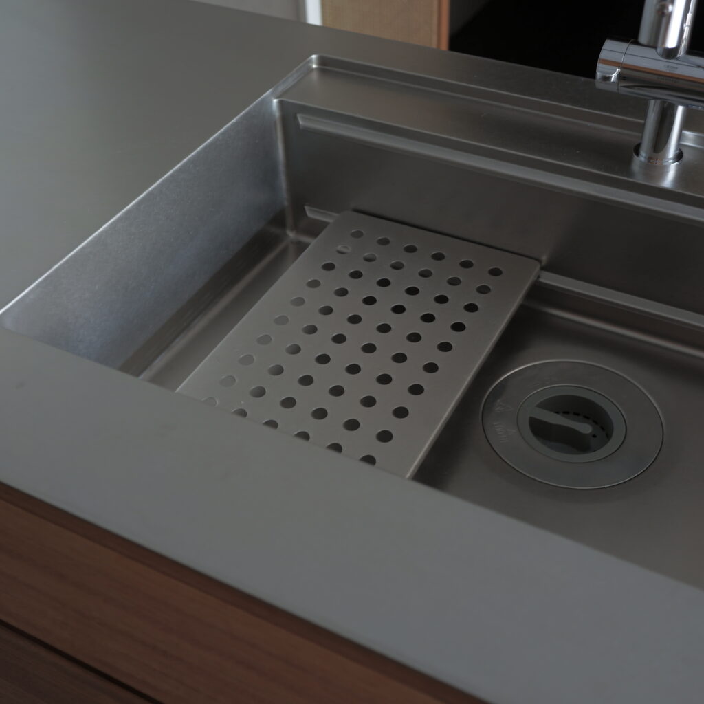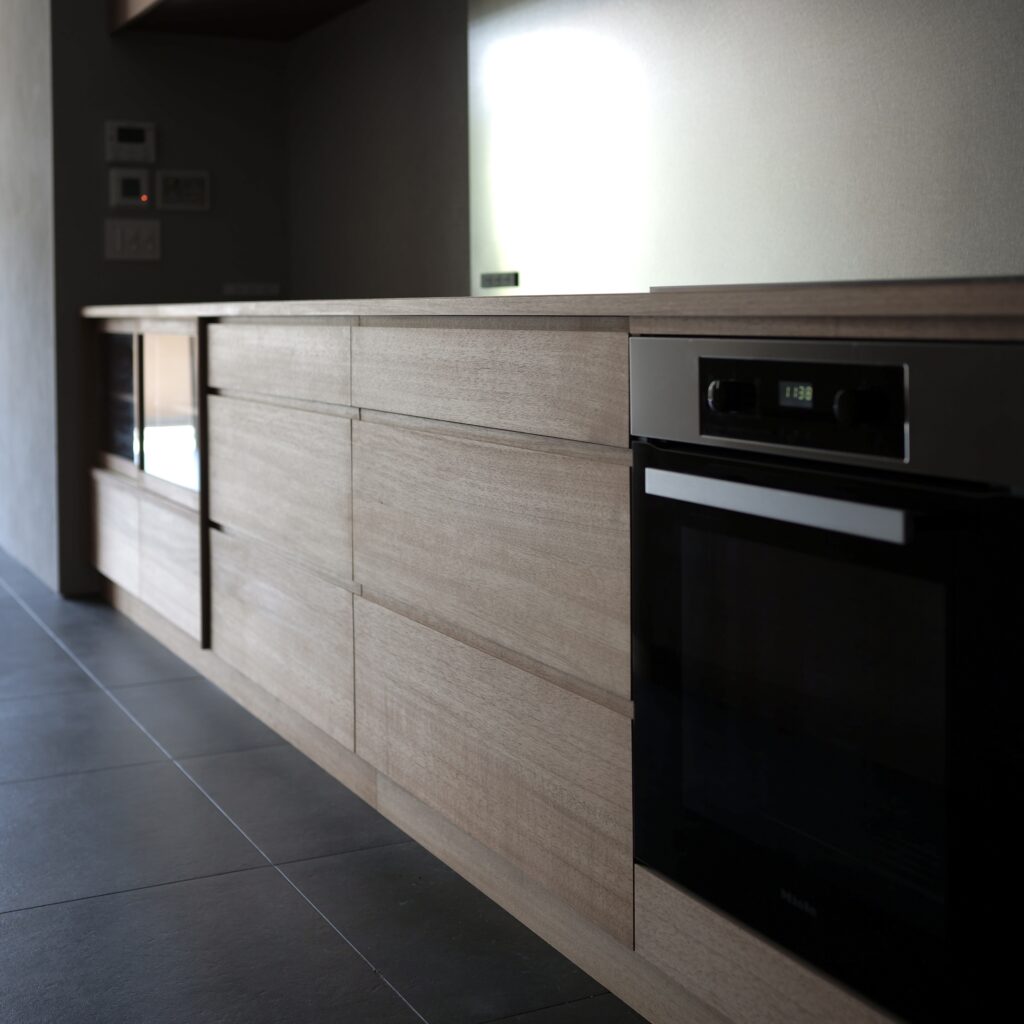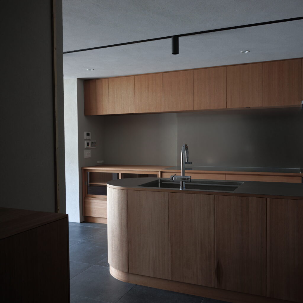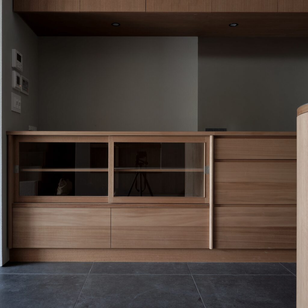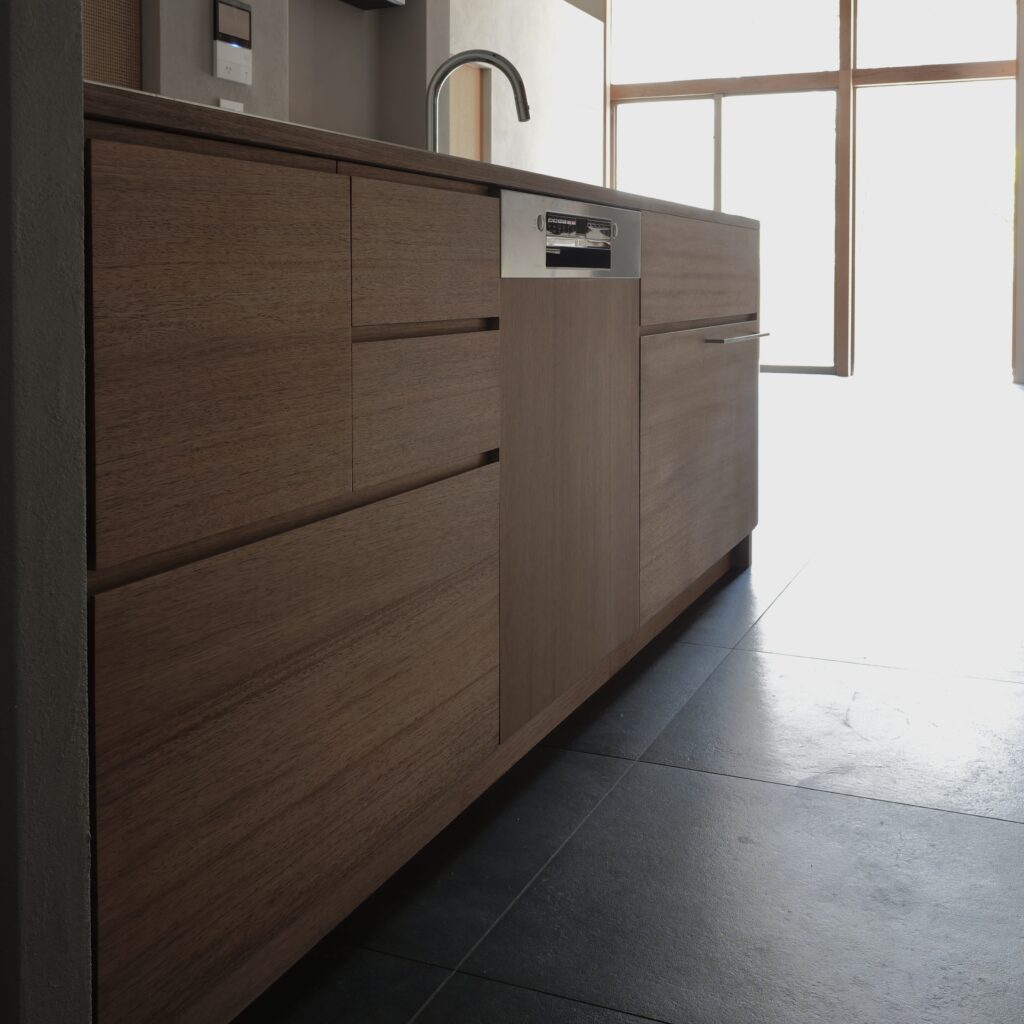 kt07 work top : sus phl / nyatoh cabinet : nyatoh, oil finish cooktop:miele oven:miele dishwasher:bosch
